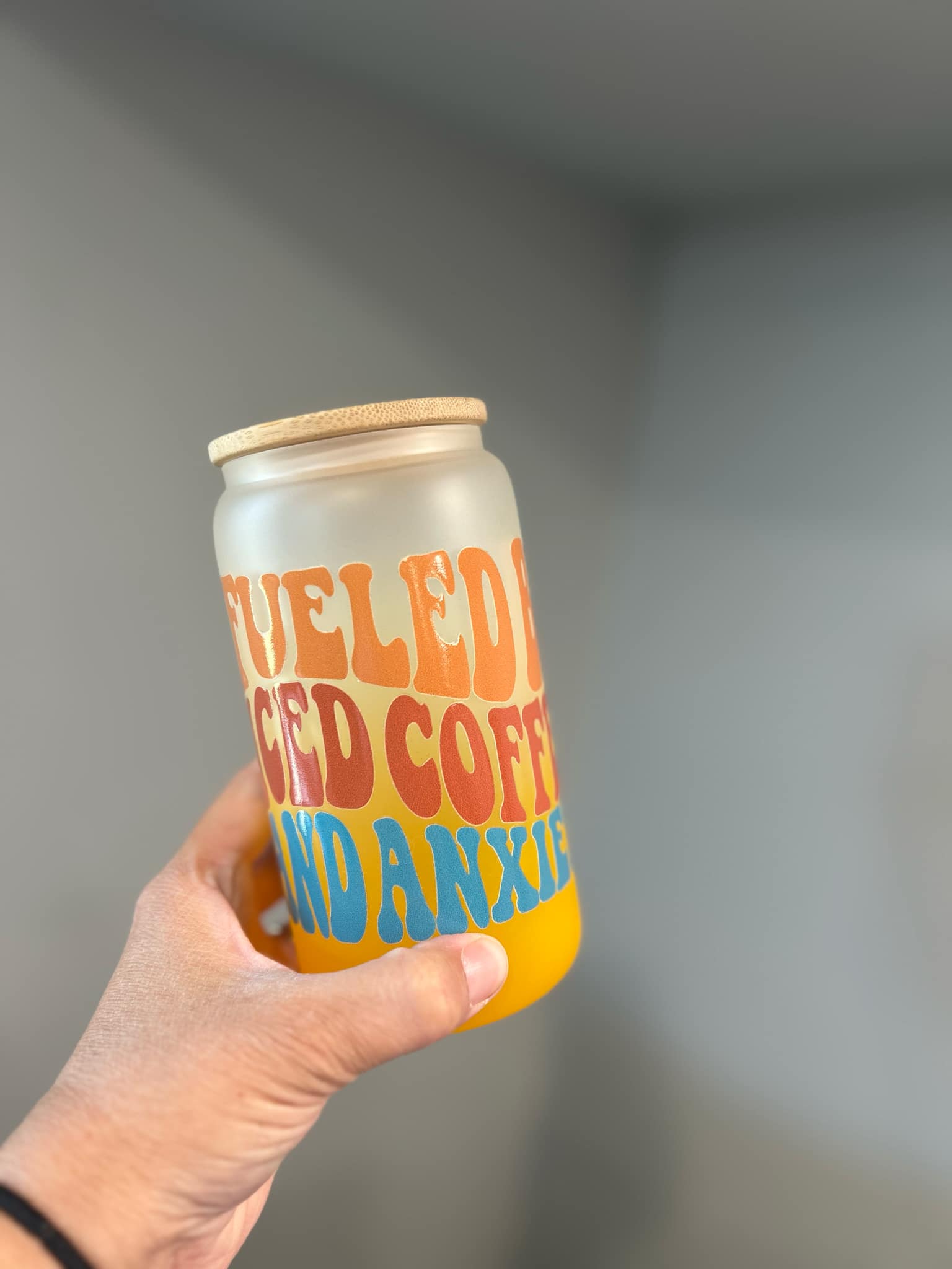 16oz glass can in frosted ombre orange.